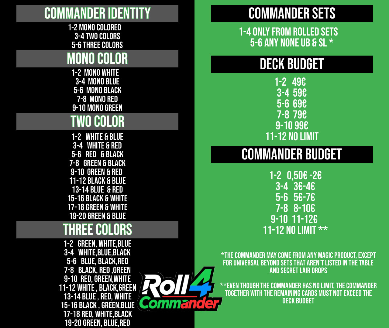 Habt ihr dies bestimmt wird noch bestimmt welches Budget ihr beim Deckbau habt , und wieviel von eurem Budget der Commander kosten darf.