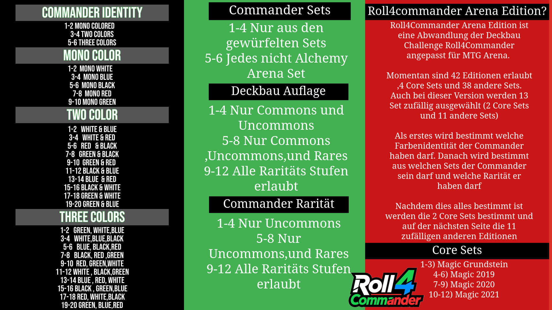 Die Roll4Commander Arena‑Edition läuft ähnlich ab wie das normale Roll4Commander, nur mit weniger Sets und ohne Alchemy‑Karten sowie ohne Karten, die immer für den Deckbau verfügbar sind (dies könnte sich jedoch ändern).